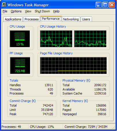 Check your PC's RAM usage by opening Windows Task Manager. Press Ctrl-Alt-Del (Vista users will have to click Start Task Manager) and click the Performance tab. If the figure next to 'Available' (or 'Free' in Vista) under 'Physical Memory' hovers around zero and your PC seems sluggish, you need more RAM.